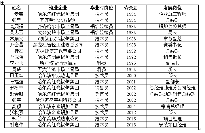 毕业生被哈尔滨锅炉厂、无锡华光锅炉集团、武汉武锅能源集团、浙江特富锅炉集团、江苏双良锅炉集团、哈尔滨红光锅炉集团、哈尔滨团结锅炉集团、哈尔滨红旗锅炉厂、中国能源建设集团、黑龙江省建工集团、中国北方安装集团、哈锅锅炉工程公司、中国大唐集团、哈投集团、捷能热力公司、威立雅集团等大型央企单位录用,年薪可达10-30万。