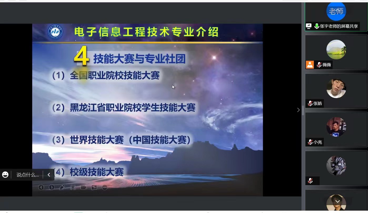 9月27日,汽车与动力学院电子信息工程技术专业线上召开了2022级新生专业说明会,参会人员有专业主任陈健巍、教师张宇、戴明雪、高卉及2022级电子信息工程技术专业全体新生。