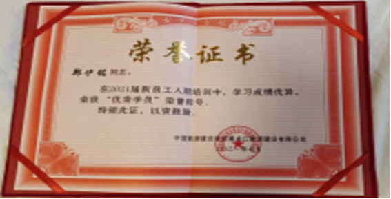 2021年获中国能源建设集团黑龙江省能源建设有限公司“优秀学员”荣誉称号;