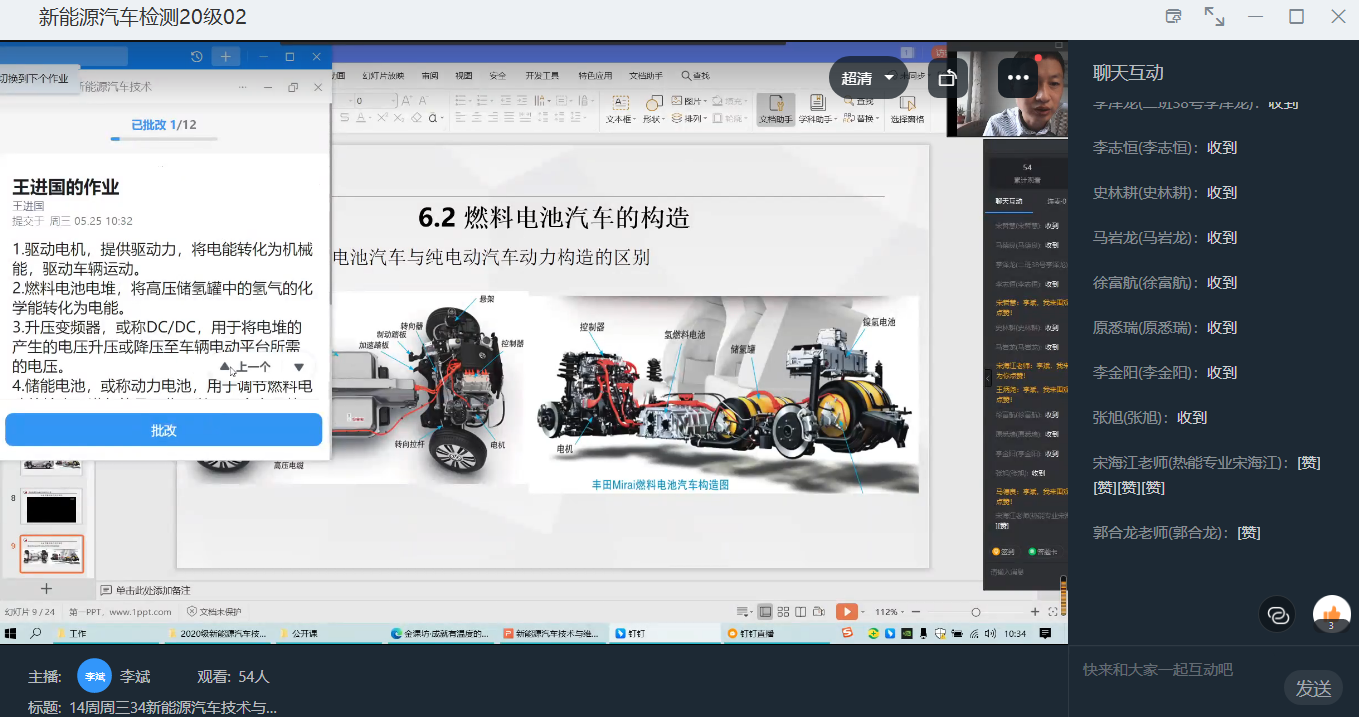 李斌老师主讲《新能源汽车技术与维护》课程,项目6燃料电池汽车的认知,运用钉钉平台和金课坊平台进行线上教学。授课班级是汽车检测20-02班,班级人数34人,出勤人数34人。参加听、评课的有质量监控中心(学校督导)和5个学院及其他部门共25人,学校督导2人,5个分院教师20人,部门领导3人。
