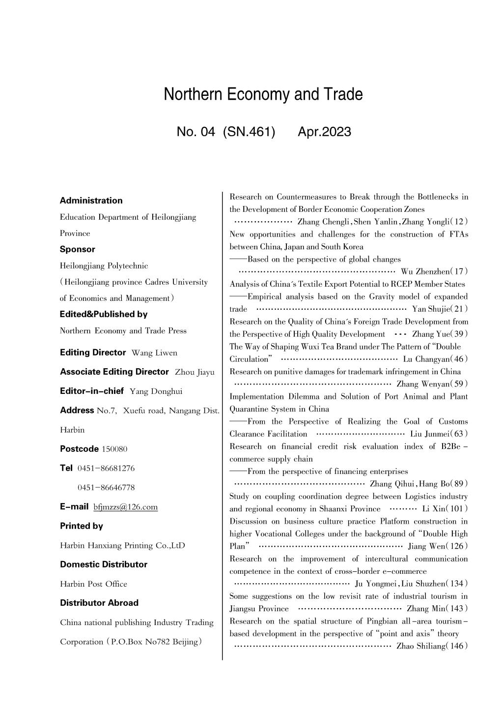 版权所有:北方经贸杂志社 地址:黑龙江省哈尔滨市南岗区学府路5号 邮编150080 电话:0451-86681276 86646778 邮箱:bfjmzzs@126.com