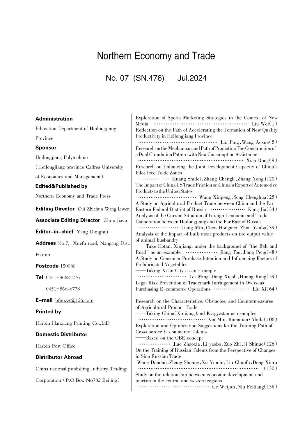 版权所有:北方经贸杂志社 地址:黑龙江省哈尔滨市南岗区学府路5号 邮编150080 电话:0451-86681276 86646778 邮箱:bfjmzzs@126.com