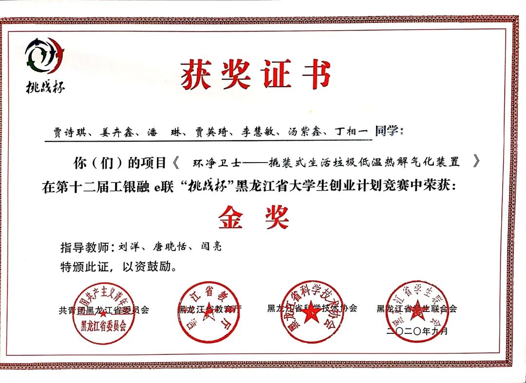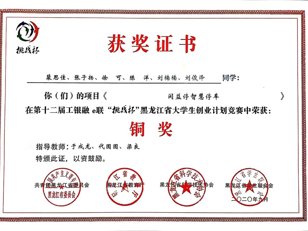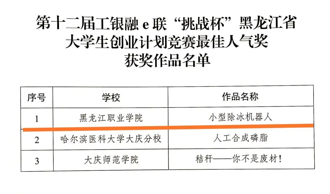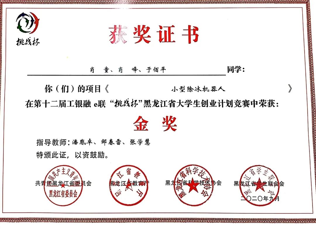 9月8日,团省委、省教育厅、省科学技术协会、省学生联合会联合印发了《关于表彰第十二届工银融e联“挑战杯”黑龙江省大学生创业计划竞赛获奖集体和个人的决定》(黑青联字[2020]13号)文件,在全省各高校209件作品入围决赛的作品中,永利官网参赛项目荣获大赛金奖4项、银奖2项、铜奖3项,有3项作品被推荐至国赛,由机械工程学院潘胤卓老师指导、肖童同学负责的《小型除冰机器人》项目以总票数排名第一的成绩荣获“最佳人气奖”,永利官网荣膺大赛“优胜杯”,创造了永利官网“挑战杯”参赛史最佳成绩。