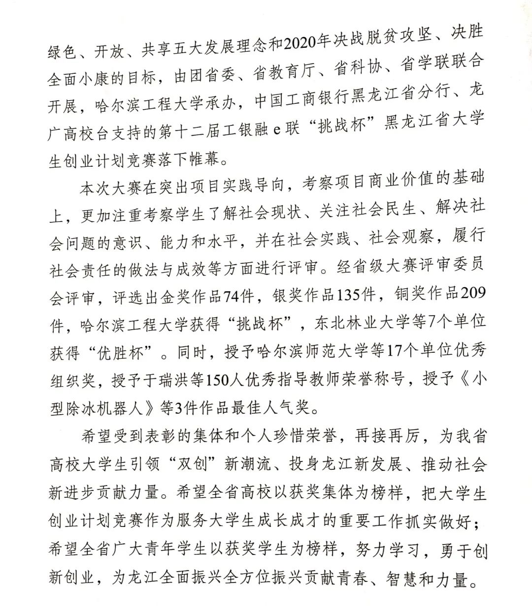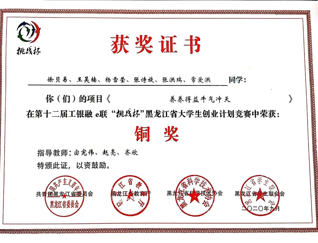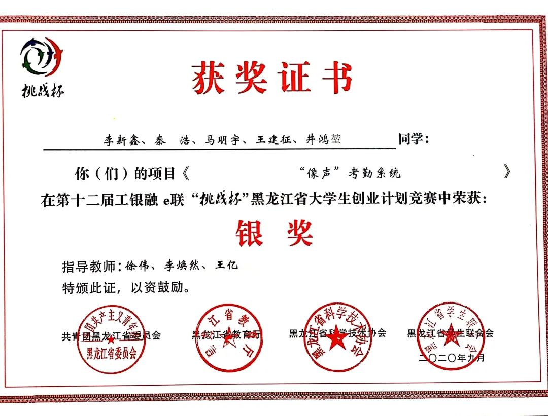 9月8日,团省委、省教育厅、省科学技术协会、省学生联合会联合印发了《关于表彰第十二届工银融e联“挑战杯”黑龙江省大学生创业计划竞赛获奖集体和个人的决定》(黑青联字[2020]13号)文件,在全省各高校209件作品入围决赛的作品中,永利官网参赛项目荣获大赛金奖4项、银奖2项、铜奖3项,有3项作品被推荐至国赛,由机械工程学院潘胤卓老师指导、肖童同学负责的《小型除冰机器人》项目以总票数排名第一的成绩荣获“最佳人气奖”,永利官网荣膺大赛“优胜杯”,创造了永利官网“挑战杯”参赛史最佳成绩。