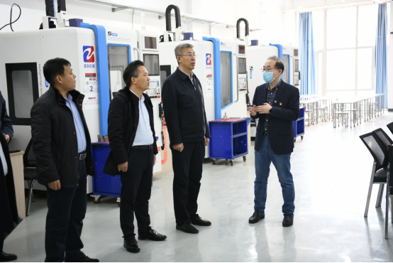 在王利文、王明海陪同下,考察团参观了永利官网智能制造技术学院的工业中心、多轴加工实训室、增材制造实训室、数字化检测实训室、工业机器人训练中心和信息工程学院的华为认证VUE考试中心、虚拟现实工作室、录播室、大数据实训室。智能制造技术学院院长李子峰、信息工程学院院长张晓霖对实训室建设进行详细介绍。