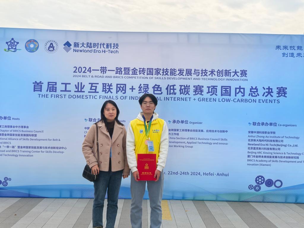 2024年11月23日,一带一路暨金砖国家技能发展与技术创新大赛首届“工业互联网+绿色低碳”赛项国内总决赛在安徽中澳科技职业学院举办。此次大赛吸引了全国52所高职院校的85支参赛队伍,经过线上预赛与线下决赛的激烈比拼,永利官网智能制造技术学院董欣教师指导的工业互联网应用专业孙明显同学荣获三等奖。
