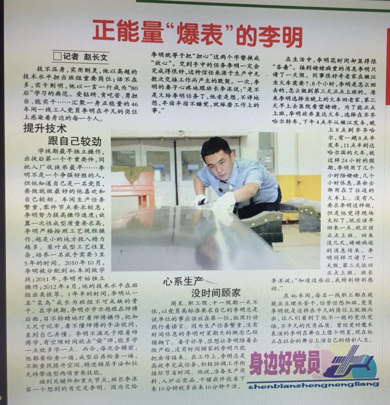 2010年10月,李明被分配到46车间做学徒,2011年李明开始独立操作,2012年4月他的技术水平在班组出类拔萃,一年半的时间里明从一名菜鸟成长为班组不可或缺的骨干。他在学徒期,李明亦步亦趋跟在师傅后面,目不转睛的盯着师傅的操作,把加工尺寸及看在心里,不懂的就问,直到自己弄懂。李明不满足于跟着师傅学,有空隙有时间就去偷师,能多学一点就多学一点,而今每次合模前,他都要检查一遍,成型后再检查一遍,不断查找提升空间。碰到关键件和重大节点,班长李沫第1个想到的肯定是李明。因为把他交给李明,就等于把“担心”这两个字替换成“放心”。交到手中的任务李明一定会完成的很好,这种信任来源于生产中,无数次交接工作而产生的默契。一次李明的妻子,心疼的跟班长李默说,是不是又交给李明任务了?他老是想,不停的想,半宿半宿不睡觉,就琢磨工作上的事儿。他心系生产,没时间顾家,周末直供价,十一假期,一天不休,以党员高标准要求自己的李明,总是说单位的事应该放在第一位。他用行动践行着诺言,因为生产任务繁重,没有时间休息的李明,对星期天的概念已经模糊了,妻子怀孕,很想让李明陪着去做产检,没有时间顾家的李铭,只能把岳母接来,在工作上李明总是高效率完成工作任务,积极协调工序各个环节。