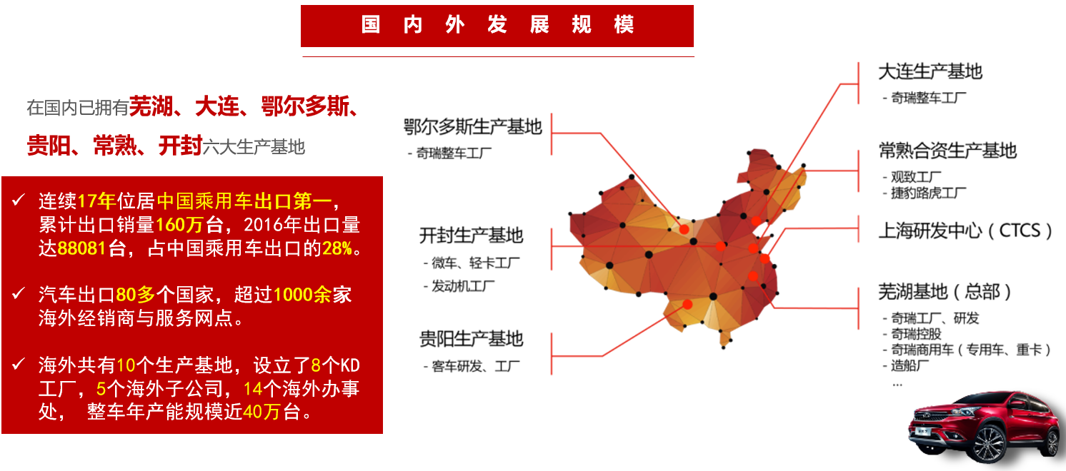 奇瑞产品覆盖乘用车、商用车、微型车等领域,现已成为国内最大的集汽车整车、动力总成和关键零部件的研发、试制、生产和销售为一体的自主品牌汽车制造企业。