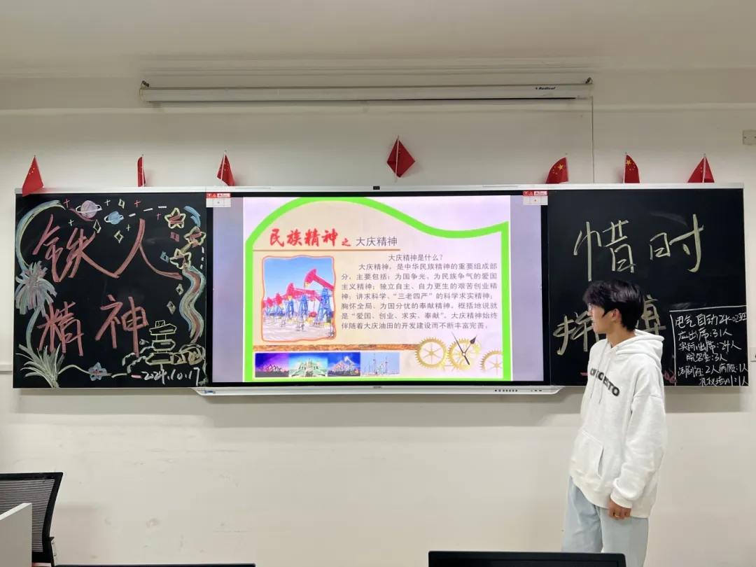 通过重温“东北抗联精神”的英勇抗争、“北大荒精神”的艰苦创业、“大庆精神”的辉煌成就以及“铁人精神”王进喜的感人事迹,激励了同学们在新时代背景下继续发扬艰苦奋斗、无私奉献的精神,为实现中华民族伟大复兴的中国梦贡献力量。