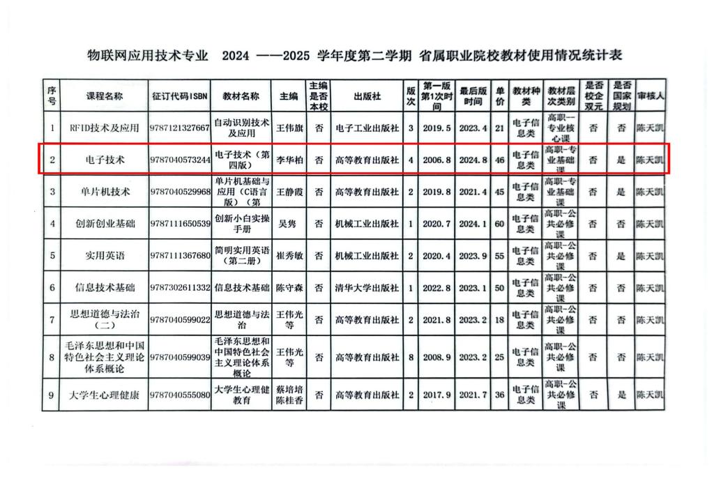物联网应用技术专业2024--2025学年度第二学期省属职业院校教材使用情况统计表