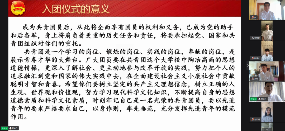 仪式第二项:团总支学生副书记周益行,说明入团仪式的意义、宣布新团员名单;