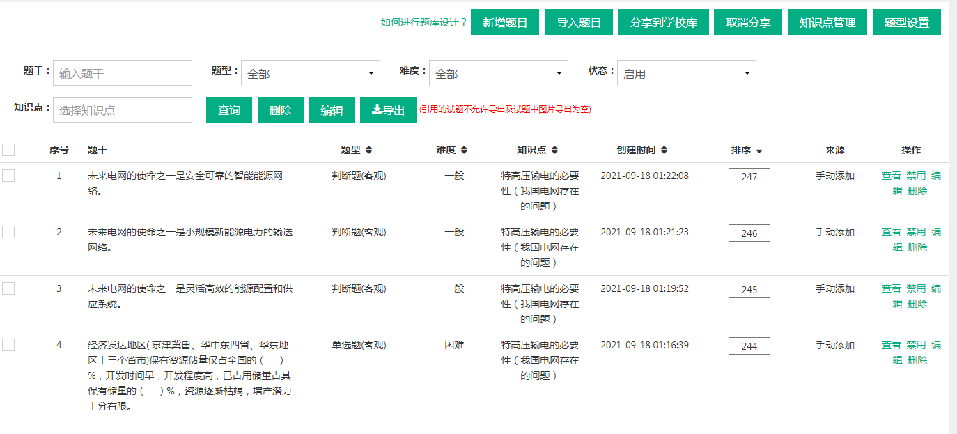 2.启用题库功能,题库可以为测验和课后作业提供习题资源,学生完成测验和课后习题后可以直接由系统打分,效率高;