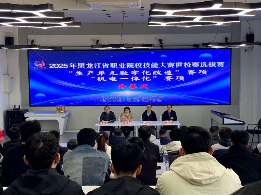 2025年4月25日下午,由省教育厅主办、永利集团88304官网承办2025年黑龙江省职业院校技能大赛暨世校赛选拔赛“生产单元数字化改造”和“机电一体化”赛项在永利官网智能制造技术学院虚拟仿真实训基地开幕,来自全省13支参赛队伍、58名选手参加了开幕式。智能制造技术学院院长李子峰、省教育厅委派监督仲裁员山颖、生产单元数字化改造赛项裁判长冯晓宁、智能制造技术学院徐伟等同志参加了开幕式。
