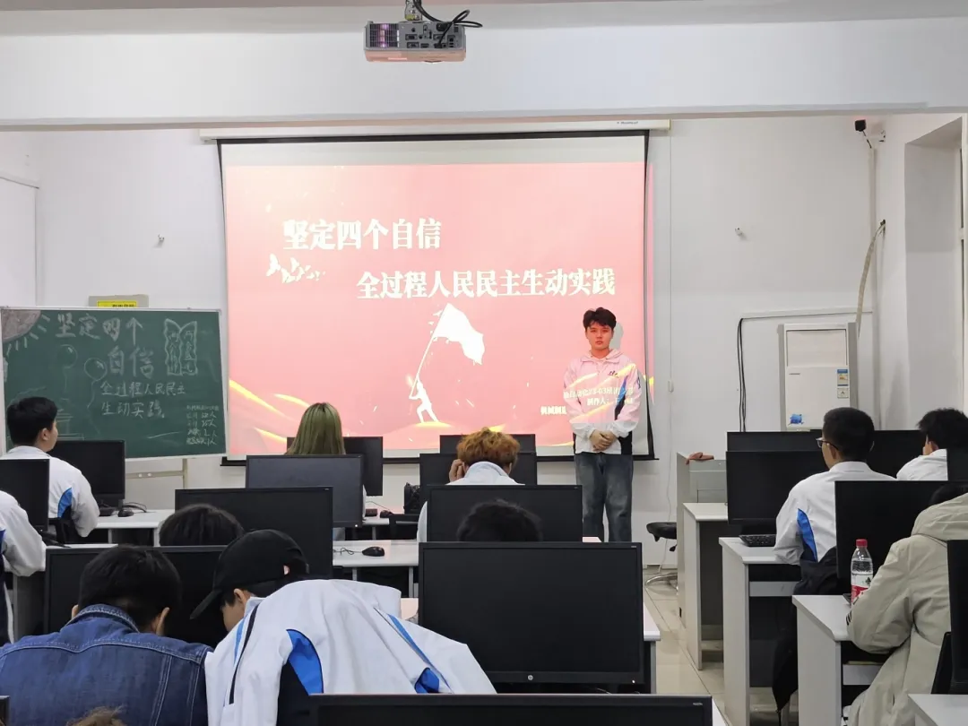 活动期间,各班团支书进行了主题演讲,深入解读“四个自信”的内涵和重要性,以及全过程人民民主的本质和特点。演讲过后,同学们分成小组,就“四个自信”与全过程人民民主的关系展开讨论。通过交流和分享,加深对这一主题的理解。最后,各班团支书进行了总结发言,强调坚定“四个自信”对于实现全过程人民民主的重要意义,并鼓励同学们在日常生活中积极参与民主实践。