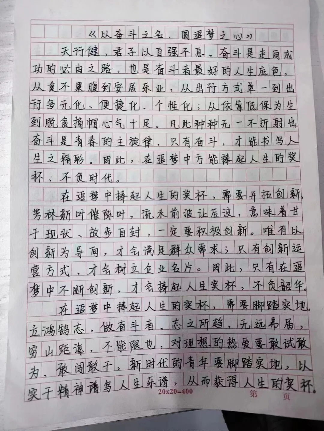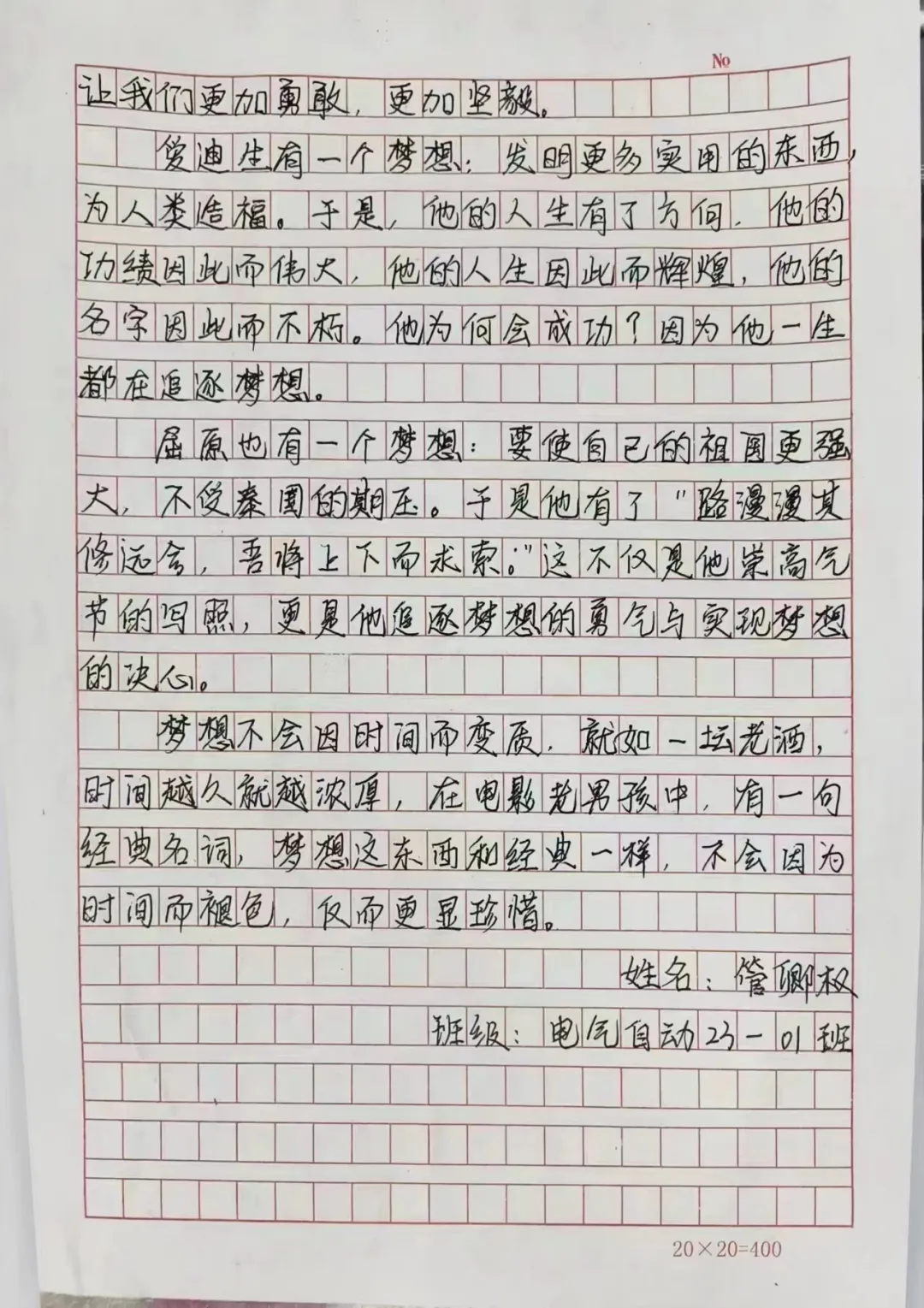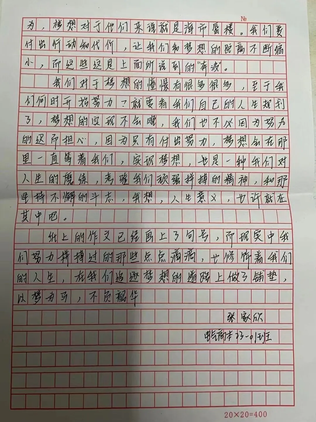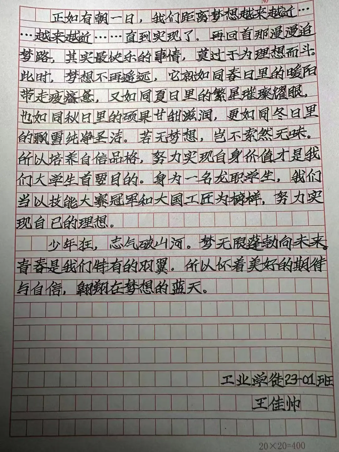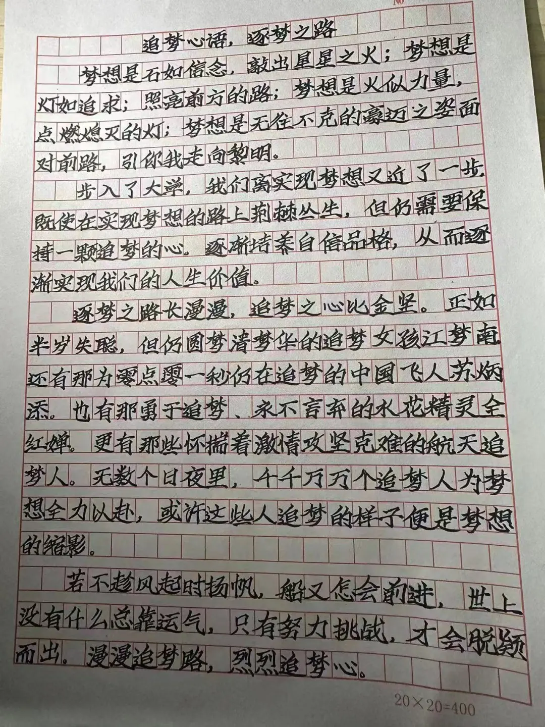 在这个充满机遇和挑战的时代,梦想是我们前进的动力。本次活动以梦想为主题,要求同学们手写创作原创文章。希望通过这种方式,让大家更深入地思考自己的梦想,以及如何在逐梦路上前行。通过书写自己的追梦心语,同学们可以更加清晰地认识到自己的目标和追求,找到为之努力奋斗的方向。