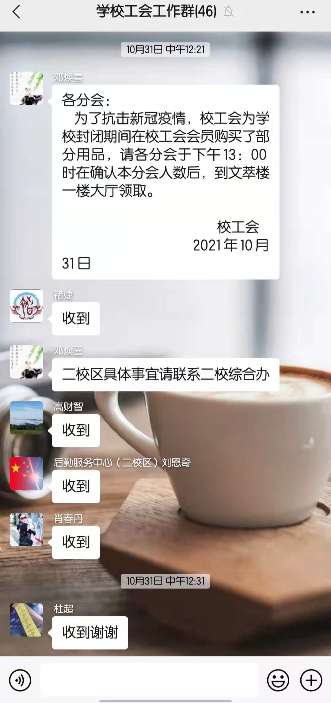 10月31日上午,学校工会全体工作人员与疫情防控的时间在赛跑,用最快的速度为封闭在校园内的教职工筹备物资,提供基本生活保障。下午1:00时,校工会将水果、方便面、洗漱洗浴用品等发放到位,二校区同步进行,让广大教职工在担当神圣使命的同时感受到学校的温暖和关爱。