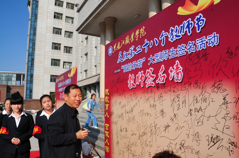 在签名活动现场,学院党委书记冯玉龙,院长赵继会,副院长刘公远、李贵林,党委副书记张玉山,纪委书记周莲香,副院长王明海等学院领导与老师们一起在“教师签名墙”上签上自己的名字,以表达对全院所有教师的节日祝贺!同学们更是争先恐后地在“学生签名墙”上郑重地签上自己的名字,为教师送上节日的祝福,载满了同学们对教师真挚的情感,传达出我院莘莘学子的心声。