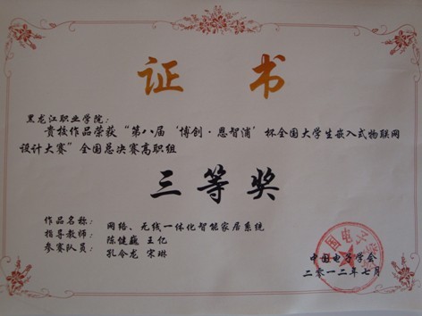 在近三个月的赛前准备中,指导教师和参赛队员克服种种困难,进行设计及调试工作。经过紧张激烈角逐,陈健巍、徐伟、王亿老师指导的刘宇峰、孔令龙和王东洋、孙宝侠、宋琳同学2支参赛队的设计作品分别获得了总决赛三等奖。通过本次大赛,提高了老师的实践教学经验,锻炼了参赛同学专业知识和技能,培养了他们的创新能力、团队精神,提升了我院物联网技术实力和知名度;同时与全国各个知名院校的参赛队进行了嵌入式技术的交流,开阔了视野。
