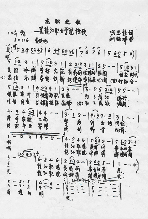 龙职之歌——永利集团88304官网校歌,词作者:冯玉龙,学院党委书记;曲作者:刘锡津,中国民族管弦乐学会会长,全国政协委员,原黑龙江歌舞剧院院长、省文化厅副厅长、中央歌剧院院长。