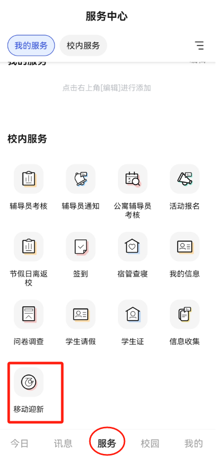点击后可在迎新服务中选择“移动迎新”进行信息采集(必填)、绿色通道(非必填)、到站登记(必填)、线上报到(必填)等业务的办理。