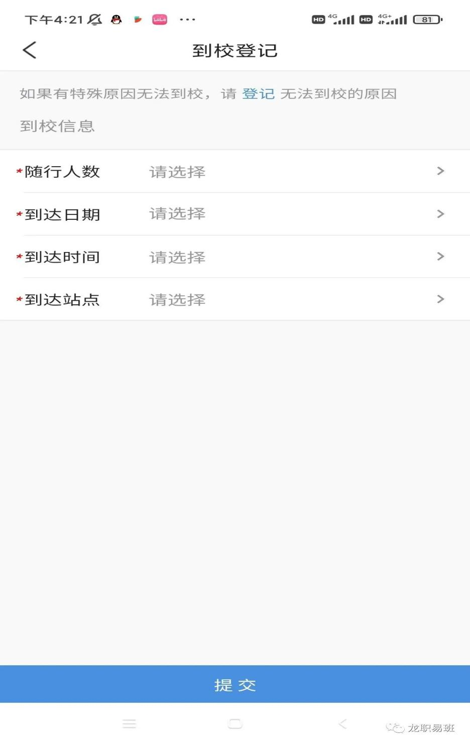 点击进入到站登记应用,按照个人实际情况填写随行人数、到站时间及到站地点,点击提交即可(到校报到时间为2025年9月4日、5日,请同学们做好计划)。
