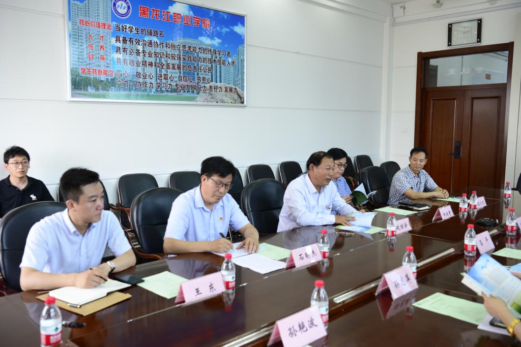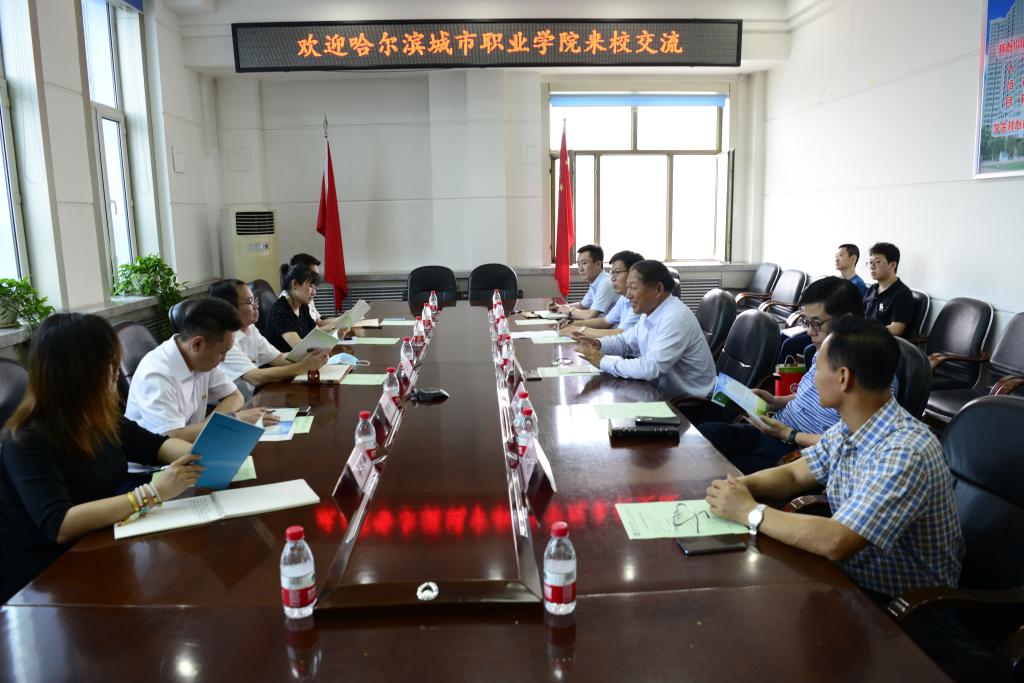 7月1日,哈尔滨城市职业学院党委书记吕平、教学副校长孙志萍、党政办公室主任段有志、宣传部副部长孙艳波、学生处处长蒋美娜一行五人来永利官网参观交流。学校党委书记赵继会、副校长郑福贵、学工部部长石明杰、宣传统战部部长尚久悦、办公室副主任王东热情接待来访客人。