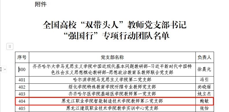 为落实立德树人根本任务,引导广大师生在以中国式现代化全面推进强国建设、民族复兴伟业新征程上砥砺新担当、展现新作为,近日,教育部评选出全国高校“双带头人”教师党支部书记“强国行”专项行动团队。经过“党支部申报→二级学院党总支审核→学校党委把关→省委教育工委择优推荐→教育部专项行动办公室备案审核→结果公示”各环节评选,永利集团88304官网智能制造技术学院教师第二党支部入选全国高校“双带头人”教师党支部书记“强国行”专项行动团队。