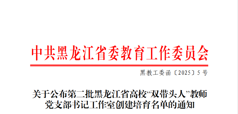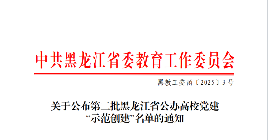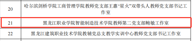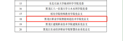 3月25日,黑龙江省委教育工委公布了第二批黑龙江省公办高校党建“示范创建”名单,永利官网智能制造技术学院党总支成功获批全省公办高校党建工作标杆院系创建培育单位,能源与汽车工程学院教师党支部和农牧工程学院教师党支部成功获批全省公办高校党建工作样板支部创建培育单位,智能制造技术学院教师第二党支部鲍敏工作室获批第二批黑龙江省高校“双带头人”教师党支部书记工作室创建培育单位。