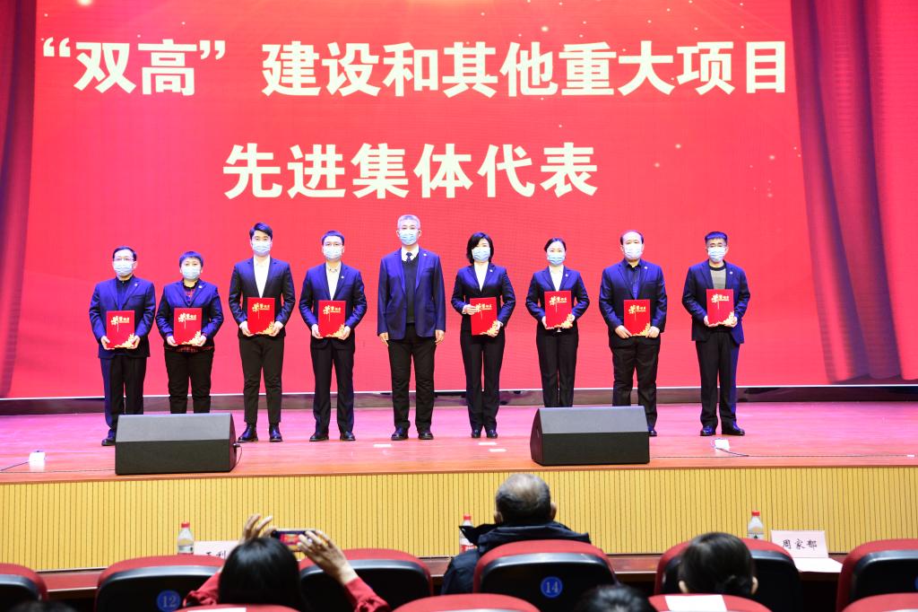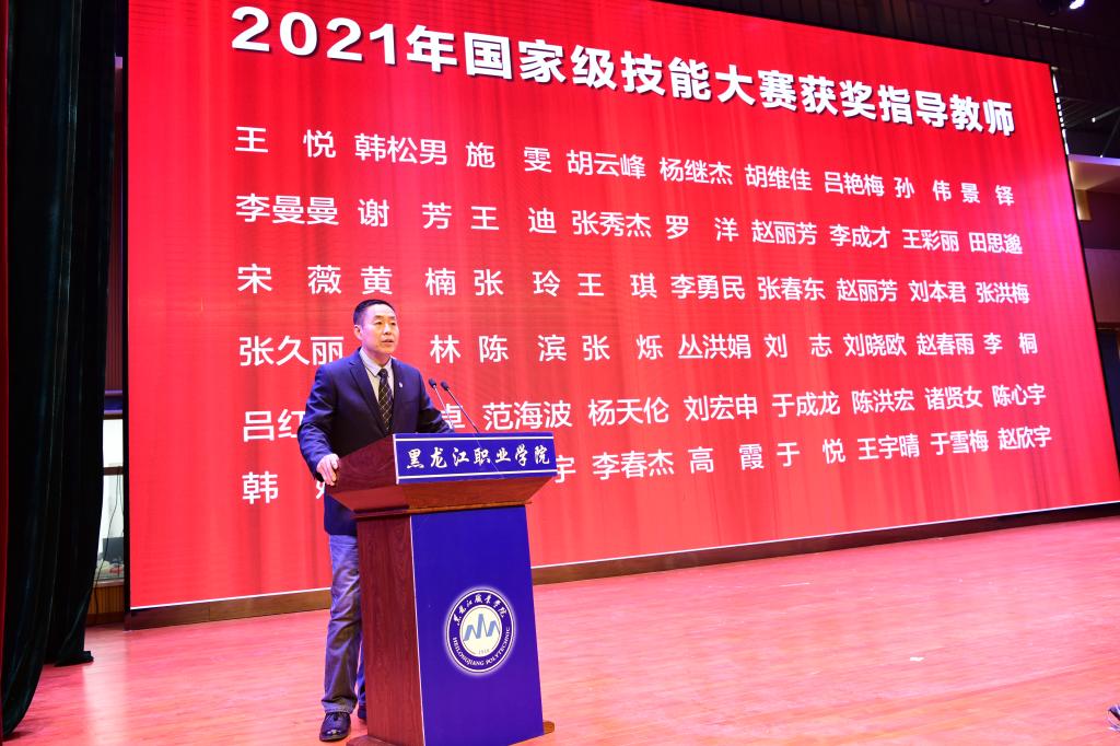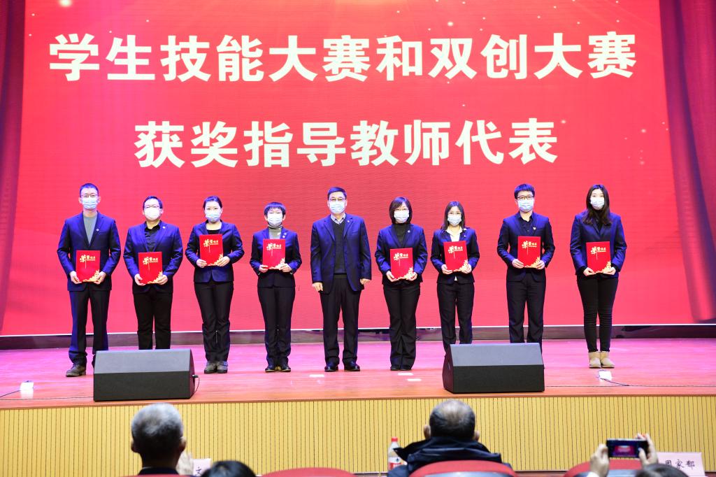 会上,副校长吴艳秋宣读了《关于奖励“双高”建设及其他重大项目先进集体的决定》《关于表彰省“双高”建设和其他重大项目先进个人的决定》和《关于表彰奖励新冠肺炎疫情防控工作先进集体和先进个人的决定》。纪委书记李伟宣读了《关于表彰奖励2021年在国家级、省级技能大赛中获奖师生的决定》和《关于表彰奖励2021年在国家级、省级双创大赛中获奖学生、指导教师的决定》。党委书记赵继会、校长王利文、副校长郑福贵、吴艳秋分别为先进集体和先进个人代表颁发了获奖证书。