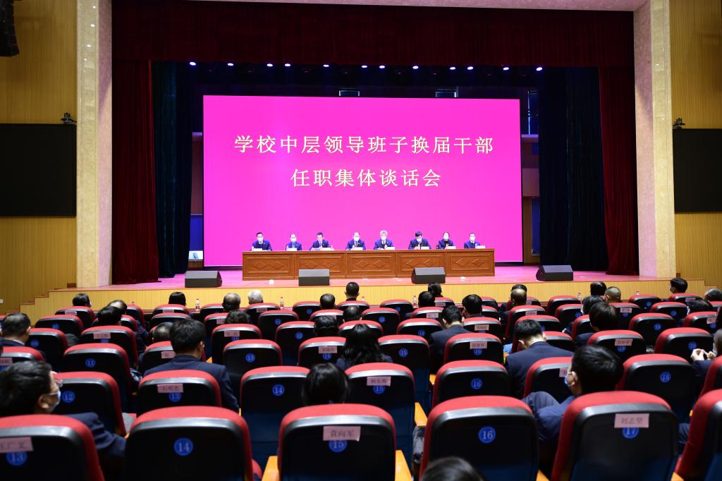 2月20日,学校召开中层领导班子换届干部任职集体谈话会。学校党委书记赵继会,党委副书记、校长王利文,党委副书记周家郁,党委委员、副校长郑福贵,党委委员、副校长王明海,党委委员、副校长吴艳秋,纪委书记李伟,党委委员、组织部部长钟敏强出席会议,学校新一届中层领导干部和不再担任处级领导职务的同志共100余人参加了会议。会议由王利文主持。