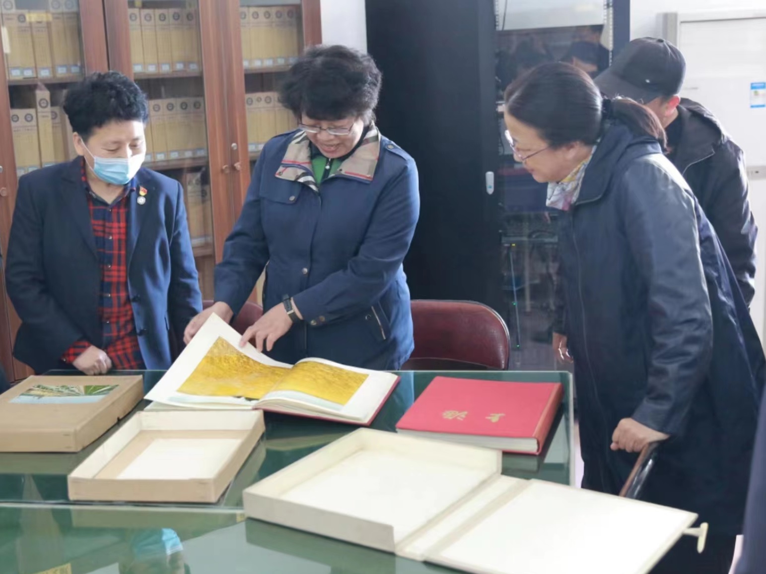 ▲党委书记崔治春勘阅中华人民共和国成立十周年黑龙江画册