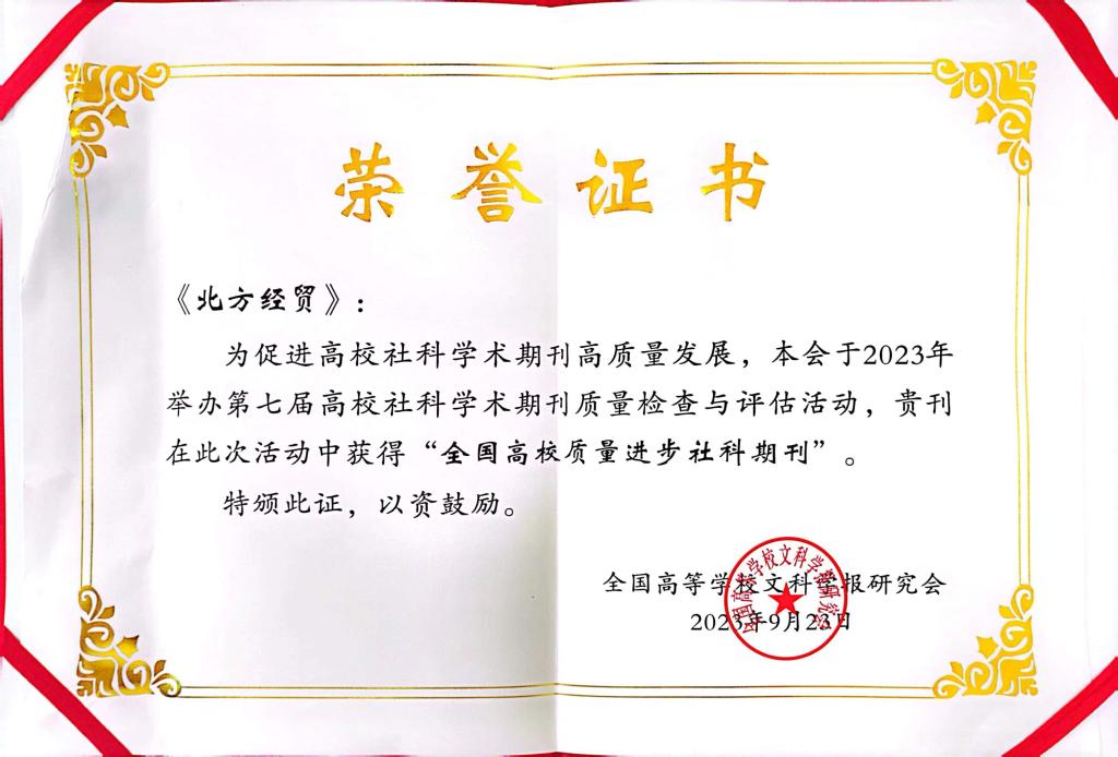 全国高等学校文科学报研究会是教育部主管的学术性、全国性、非营利性的社会组织,国家一级学会,是我国高等学校学术期刊界最为重要的组织机构之一。研究会每四年组织一次全国性的高校社科学术期刊评优活动,综合考量期刊的政治标准、学术水平、社会影响、编辑质量、出版质量等五项指标,全国参评社科期刊一千多家。《北方经贸》获评“全国高校质量进步社科期刊”是学术界、期刊界对永利官网办刊质量的充分肯定,也是当前学校高质量建设的又一项重要成果,对进一步打造学术期刊精品、推进学术创新、扩大学术影响力具有重要意义。《北方经贸》全体编辑将以此为契机,以更高的标准和更好的质量,继续为学校学科建设、地方发展和学术界繁荣作出贡献。