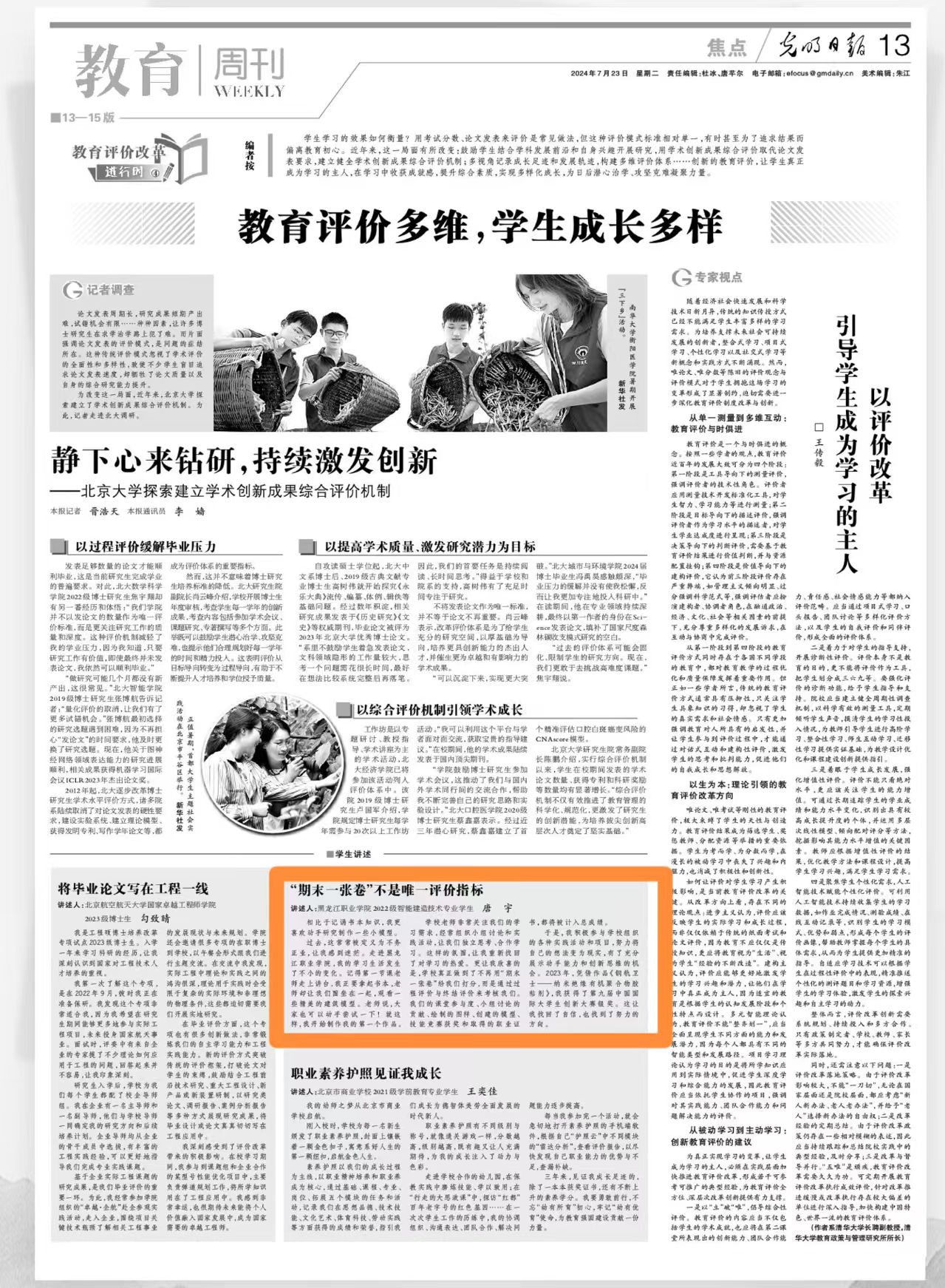 编者按:《光明日报》(2024年07月23日 13版)“教育评价改革进行时”专栏对永利官网课程评价方式进行报道。学生唐宇用自己的经历真实讲述永利官网课程评价方式的根本性变化,以及在全新的评价方式中的自我肯定和超越。文字不多却句句体现了对课程评价方式的认可和称赞——