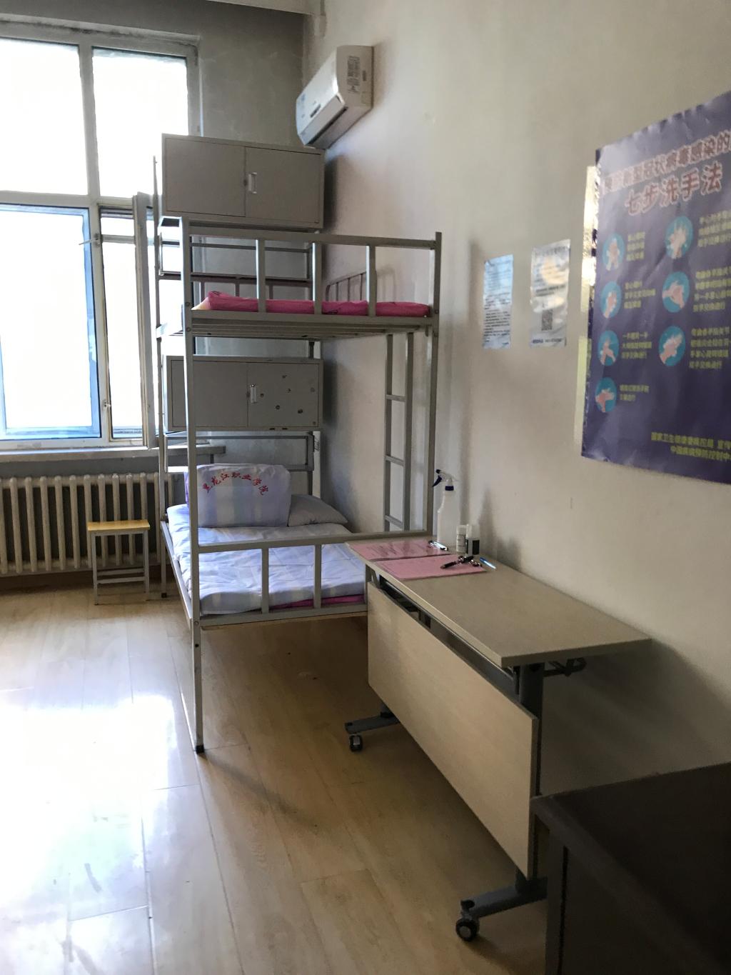 按照省教育厅、学校疫情防控小组相关规定及要求,公寓管理中心按照一人一间,备有独立洗手间的防疫要求设置隔离观察区域,精准落实隔离区域打造工作。在隔离区配备远红外测温仪、洗手液、体温计等防疫用品,配备隔离区域人员体温自检登记表、建立隔离区信息上报微信群,以保证隔离区学生身心健康,同时在隔离区张贴宣传海报宣传防疫防护知识。