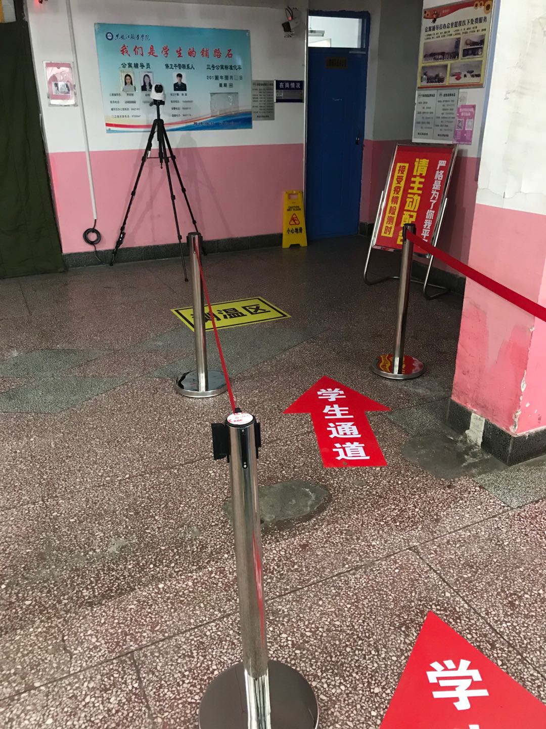 “车马未动,粮草先行”。根据学校领导指示,结合校医院专业指导和安排,学生公寓配置了远红外测温仪、测温枪等检测设备,配备了口罩、手套、防护衣等防护用品,配备了酒精、香皂、消毒凝胶、洗手液、喷洒式消毒用具等消杀用具,确保防疫物资数量充足、品种齐全。同时为配合防疫测温工作,还在公寓内设置学生导流区域,并张贴引导标识,保证测温工作有序进行。