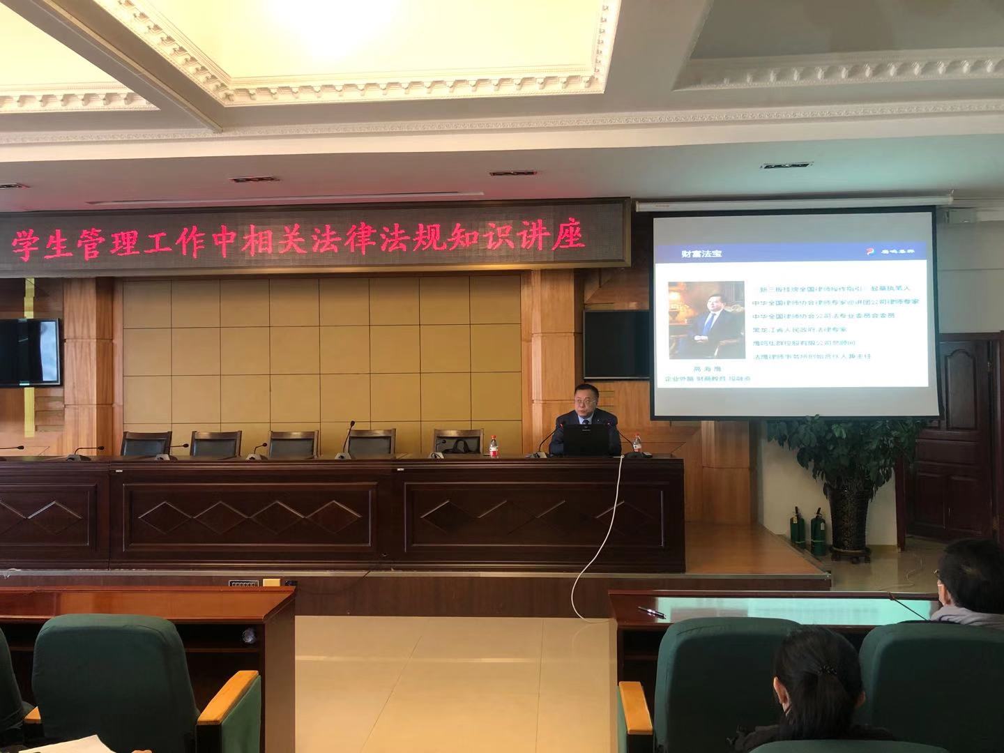 最后,学校法律顾问高海鹰律师为全体学工人员进行专题法律知识讲座。高律师从辅导员所处的工作场景、适用的法律和案例剖析三个方面指导广大辅导员和学工人员要认真学习有关法律法规,在开展工作时要做到有法可依、有据可查。并对辅导员提出的热点和难点问题给予了精彩的解答。