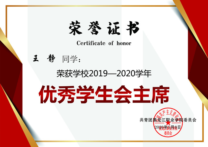 经过评审团认真评选,最终会计金融学院学生会、工商管理学院学生会和信息工程学院学生会脱颖而出,荣获2019—2020学年二级学院“标兵学生会”荣誉称号;会计金融学院王静、工商管理学院肖庆阳和信息工程学院胡银杰三名同学荣获“优秀学生会主席”荣誉称号,校团委书记邹春雷为获奖团队和个人颁发了电子版荣誉奖状和证书。