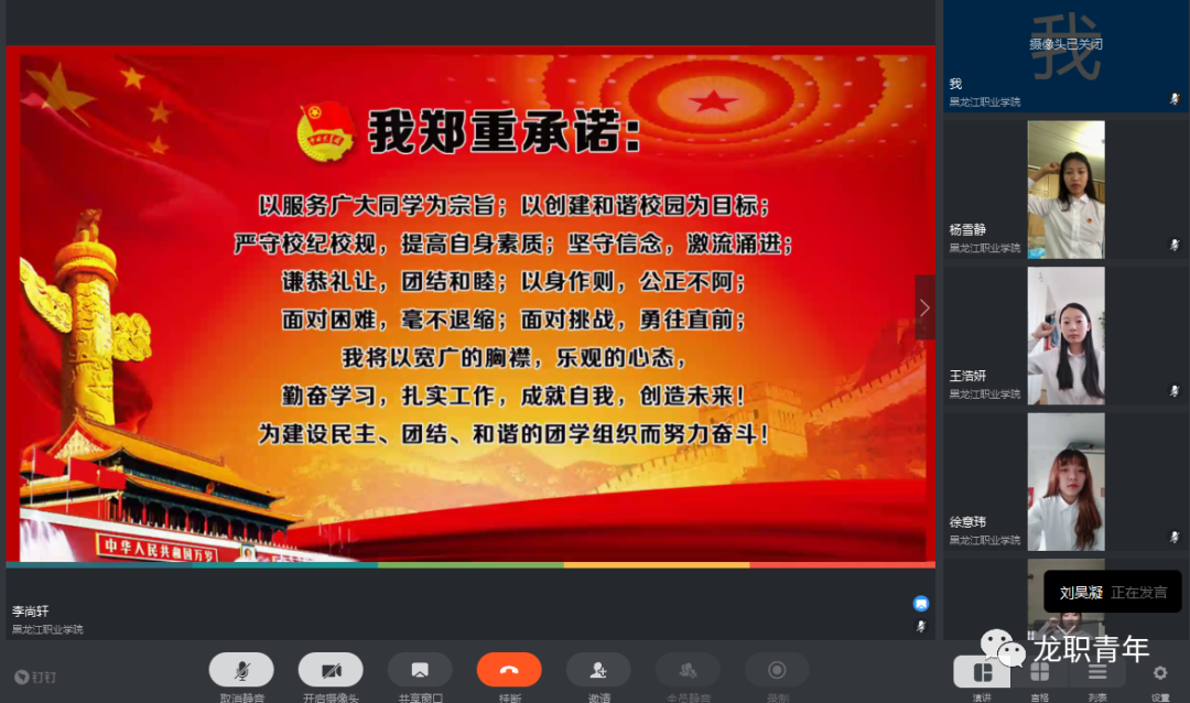 云端会上,全体学生干部起立,奏唱团歌。刘丽利宣读了2019级校新媒体中心主要学生干部名单;李尚轩宣读了2019级校社联主要学生干部名单;郭思雨宣读了2019级校学生会主要学生干部名单;陈宇航宣读了《关于校学生会、校社联、校新媒主席团分工分管的决定》;2019级校学生会主席刘昊凝带领全体学生干部进行了入职宣誓。会上,唐晓恬宣读了《关于2020-2021学年团委学生副书记的任命决定》;杜超宣读了《关于校团委老师分工分管的决定》。