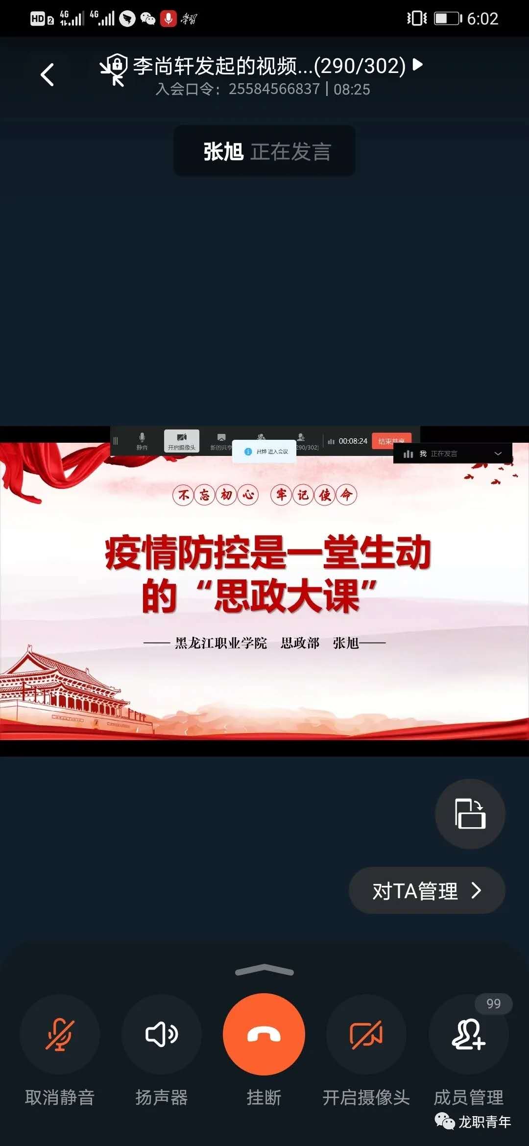 6月14日下午18:00时,第十四期“青年马克思主义者培养工程”暨大学生骨干培训班第二讲在“钉钉”平台上如期进行。本次讲座特邀永利官网思政部德育教研室张旭老师为同学们作了题为《疫情防控是一堂生动的“思政大课”》的专题讲座,校团委书记邹春雷、副书记杜超、组宣办主任唐晓恬出席本次会议,来自校学生会、校社团联合会、校新媒中心、校纪管委、校军操委、校公寓委、校关心委、校综合委、校学信委、校伙食委以及各二级学院学生会共298名2019级主要团学干部学员参加了讲座。由团委学生副书记刘丽利主持