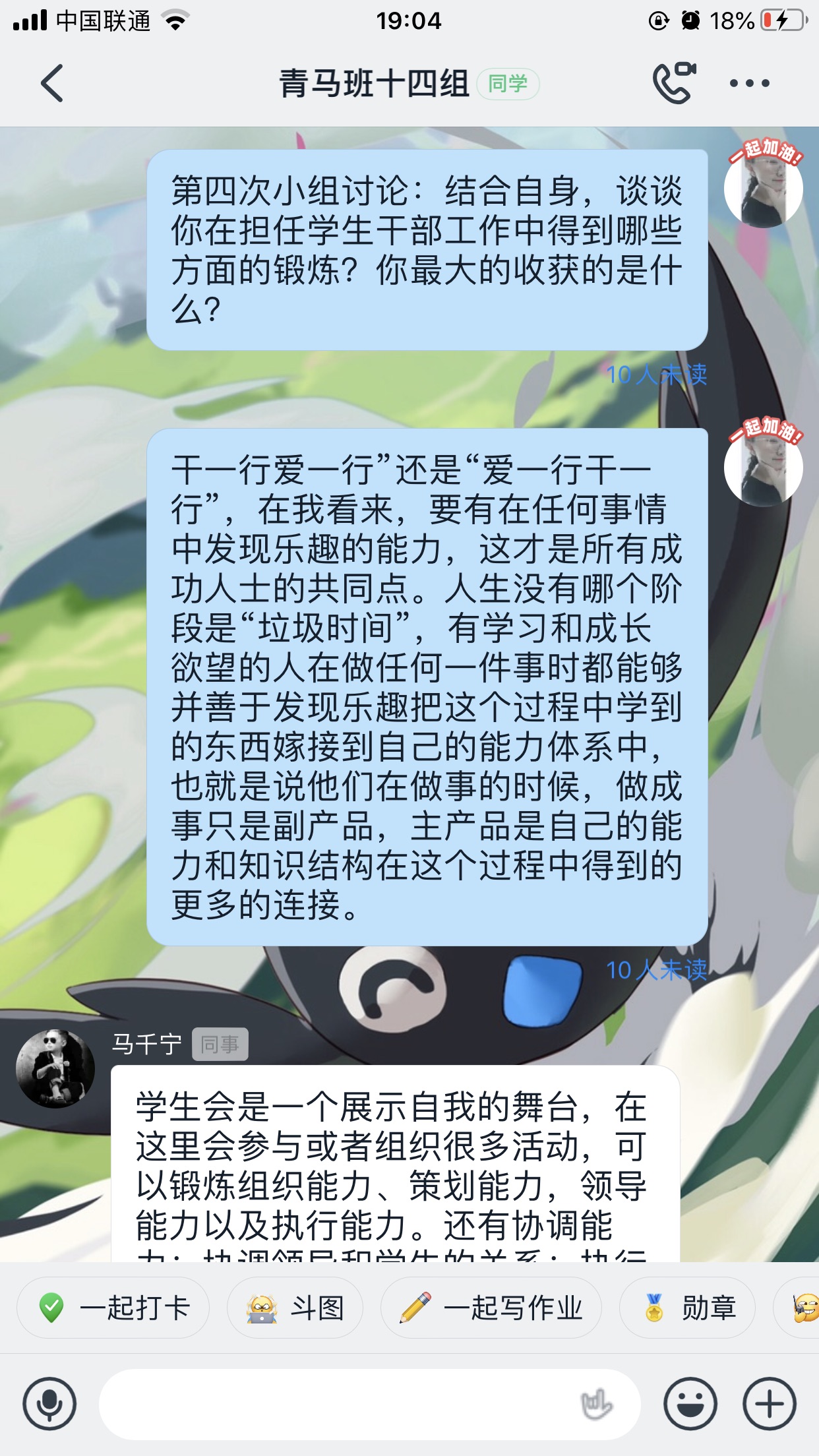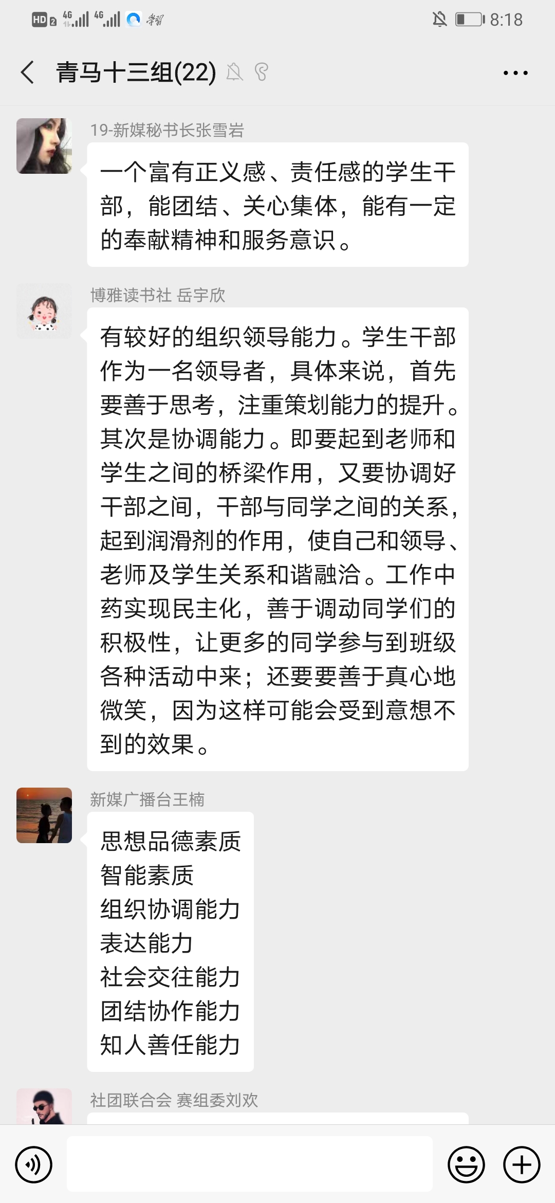 在小组讨论环节中,同学们就“结合自身,谈谈你在担任学生干部工作中得到哪些方面的锻炼?你最大的收获是什么?”进行紧张激烈的的讨论,同学们纷纷踊跃发言,担任学生干部工作中自身素质和各方面技能都得到显著的提高。对自己的工作和学习会更加严格,是在每次平凡的努力中成就了不平凡的自己。