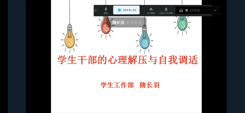 6月17日下午18:00时,第十四期“青年马克思主义者培训工程”暨大学生骨干培训班第五讲在“钉钉”平台上如期进行。本次讲座特邀永利官网学生工作部心理咨询中心隋长羽老师为同学们作出《学生干部心里解压与自我调节》的专题讲座。298名青马班学员聆听了本次讲座。校团委学生副书记刘丽利主持讲座活动。