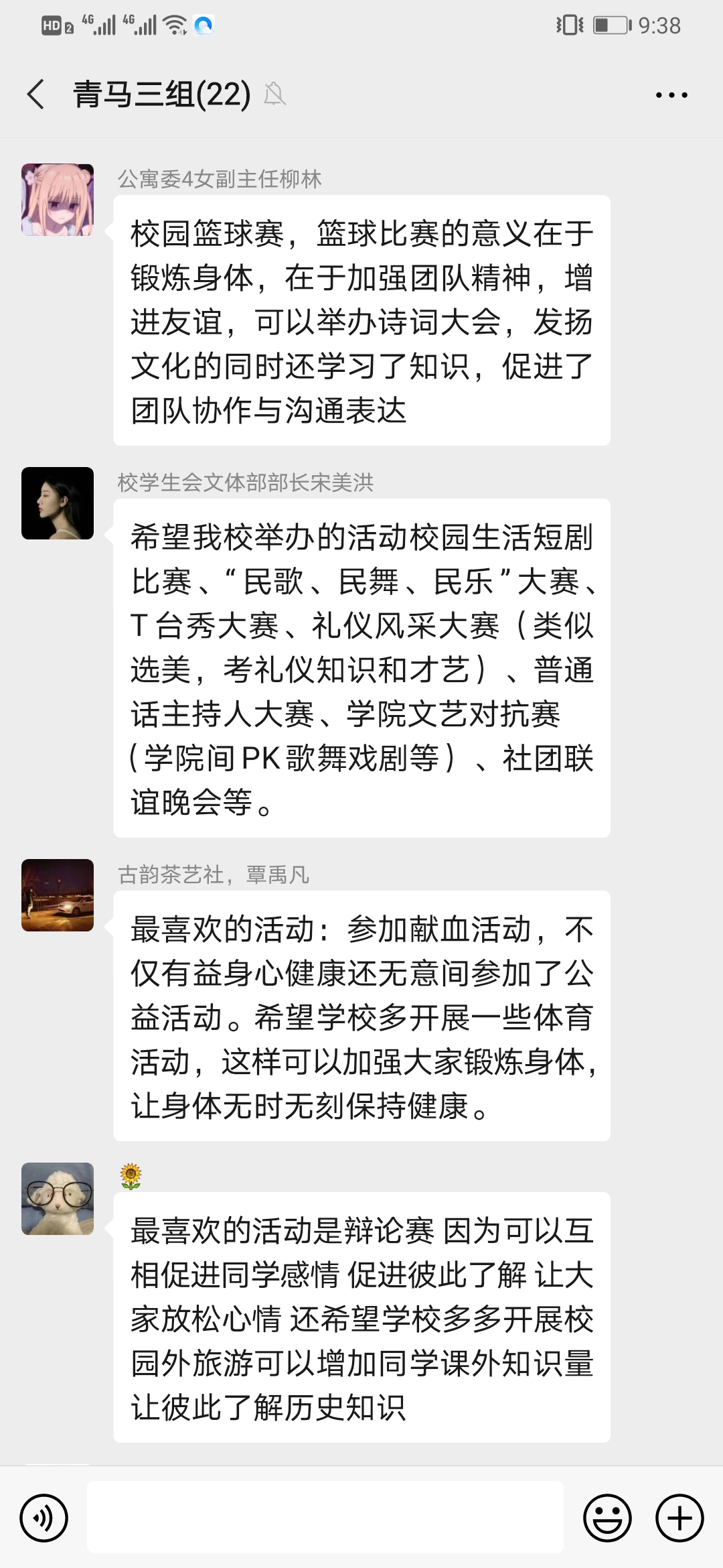 在小组讨论环节,同学们就“你喜欢参加永利官网举办的哪些学生活动?还希望永利官网能举办哪些学生活动?”展开了充分的讨论,同学们纷纷发言,并解释,学生活动可以锻炼自己、展现自己,也可以建立与人沟通的能力和交往能力,还可以锻炼大家的团队协助能力。