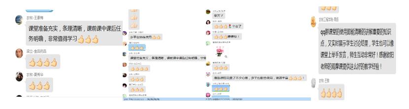 在课程结束后,参与观摩的四十余位教师在线上积极展开讨论与交流。大家一致认为欧阳慧英利用QQ课堂,将课件清晰地展示,讲解清楚明了,密切联系日常生活,多种教学方法并用,能够把握学生的理解程度,教学效果好!