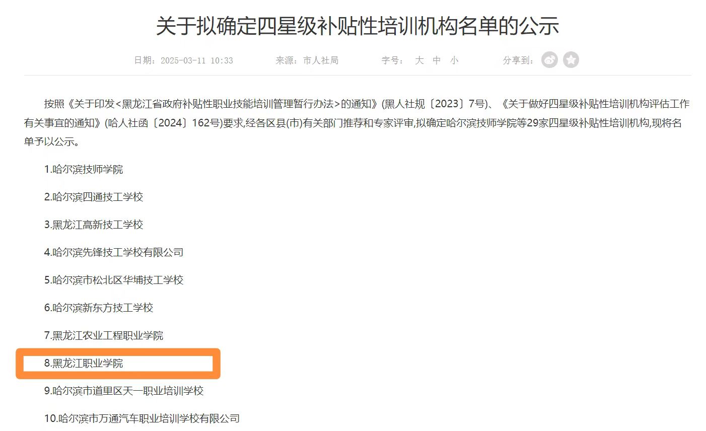 近日,哈尔滨市人力资源和社会保障局公示了《关于拟确定四星级补贴性培训机构名单》,永利官网成功入选哈尔滨市四星级补贴性培训机构。