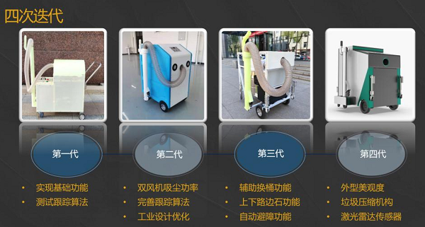自跟随垃圾清洁车经过三次迭代,具备了稳定的性能,并在永利官网物业试用后取得良好的效果反馈。第一台样机,只验证了一个基本的跟随算法,比较初级,但基本满足了使用功能。第二台样机,增加了双风机,吸力有了大幅度提升,造型上更加美观,采用了PLC控制,性能更加稳定。第三台样机,增加了上下路边石功能、智能避障功能和一个辅助换桶功能。第四台样机,就是此次参赛的作品,已经进行了工业设计,不仅美观度得到了提升,而且增加了垃圾压缩功能。一次次的更新迭代,最终诞生了这台自跟随垃圾清洁车。