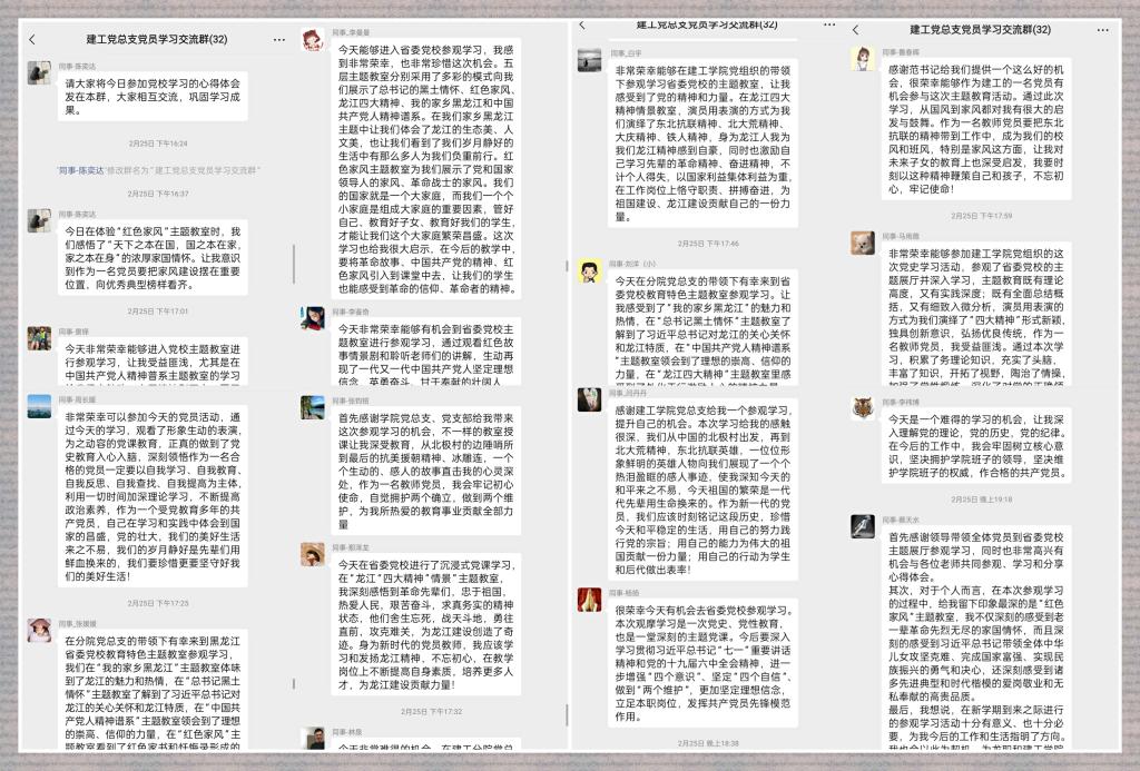 参观结束后,全体党员面对党旗高举右拳,重温入党誓词,在铿锵有力的宣誓声中表达了为共产主义事业奋斗终身的决心。同志们在“党员学习交流群”内展开了热烈的交流发言,分享自己的心得体会纷纷表示要坚定共产主义信仰,提升政治觉悟,严守政治纪律,加强党性修养,充分发挥共产党员先锋模范作用不断提高自身素为党培养更多人才,为龙江建设贡献自己的力量!