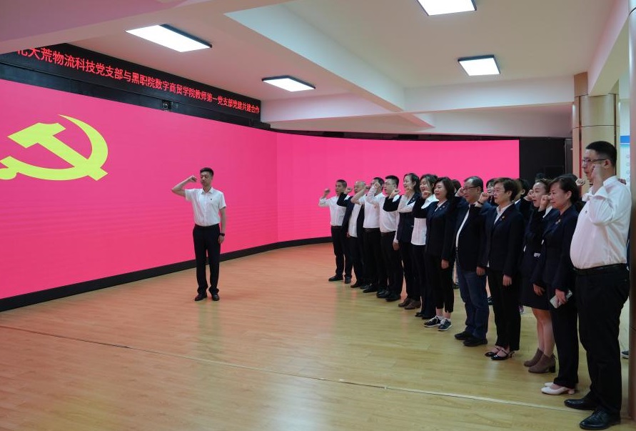 活动现场,与会领导与各位党员共同参观北大荒物流仓储交易中心,领略了北大荒物流集团数字化、智慧化的数据系统平台。签约仪式上,张玲介绍了学院概况,诚挚邀请北大荒物流集团各位领导赴永利集团88304官网参观交流。数字商贸学院教师第一党支部书记张卓远与天津北大荒物流科技党支部书记朱勇签署了党建共建协议书。最后,在鲜红的党旗下,全体党员重温入党誓词,赓续红色血脉,坚定初心使命。