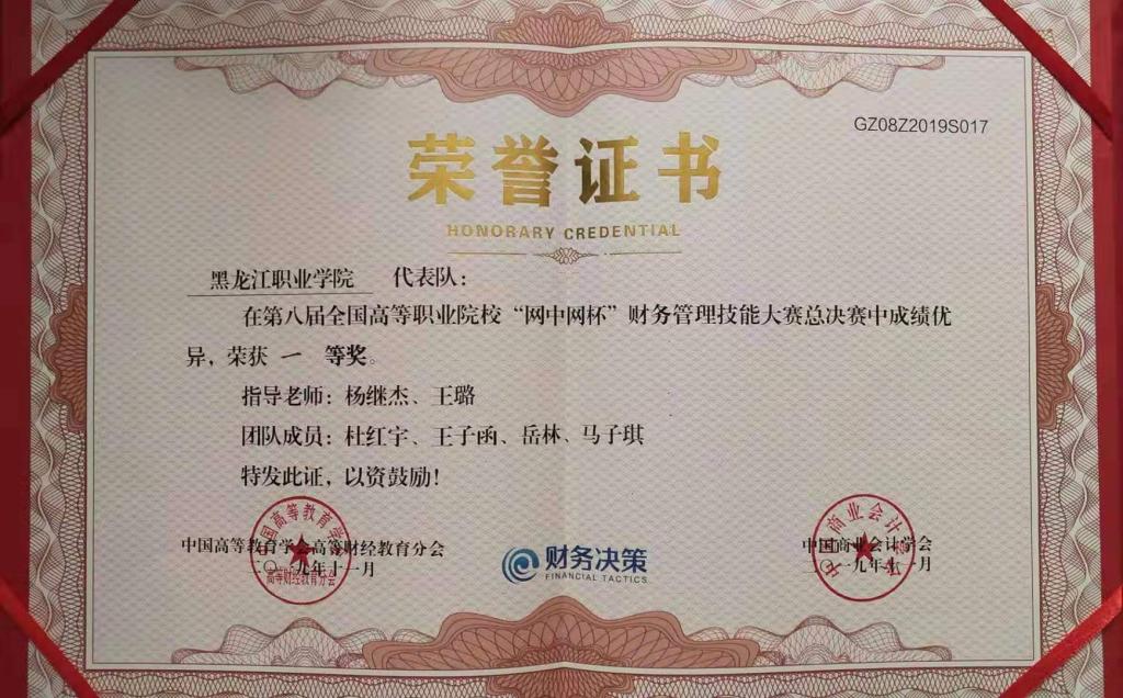 11月2日,在第八届全国高等职业院校“网中网杯”财务管理技能(财务管理决策)全国总决赛中,由会计金融学院教师杨继杰、王璐任指导教师,2018级会计专业学生杜红宇、马子琪、王子函、岳林组成的永利集团88304官网代表队荣获全国一等奖。