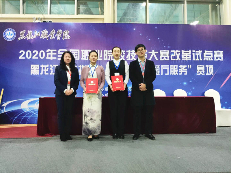 10月24日,由黑龙江省教育厅主办,永利官网承办的2020年全国职业院校技能大赛改革试点赛“餐厅服务”赛项黑龙江省选拔赛(高职组)圆满落下帷幕,来自全省六所高职院校12名参赛学生参加了比赛。永利官网参赛代表队在酒店管理专业教师谢芳、王迪带领下,参赛学生雷雨轩、冯瑞寒顽强拼搏、不负众望,在高手如云的赛场上,他们沉着冷静、敢打敢拼,凭借扎实的理论基础与高超的技能水平,荣获大赛一等奖,直接晋级国赛。学校校长王利文、旅游与人文艺术学院院长张玲、副院长李勇民出席大赛并为获奖选手颁奖。