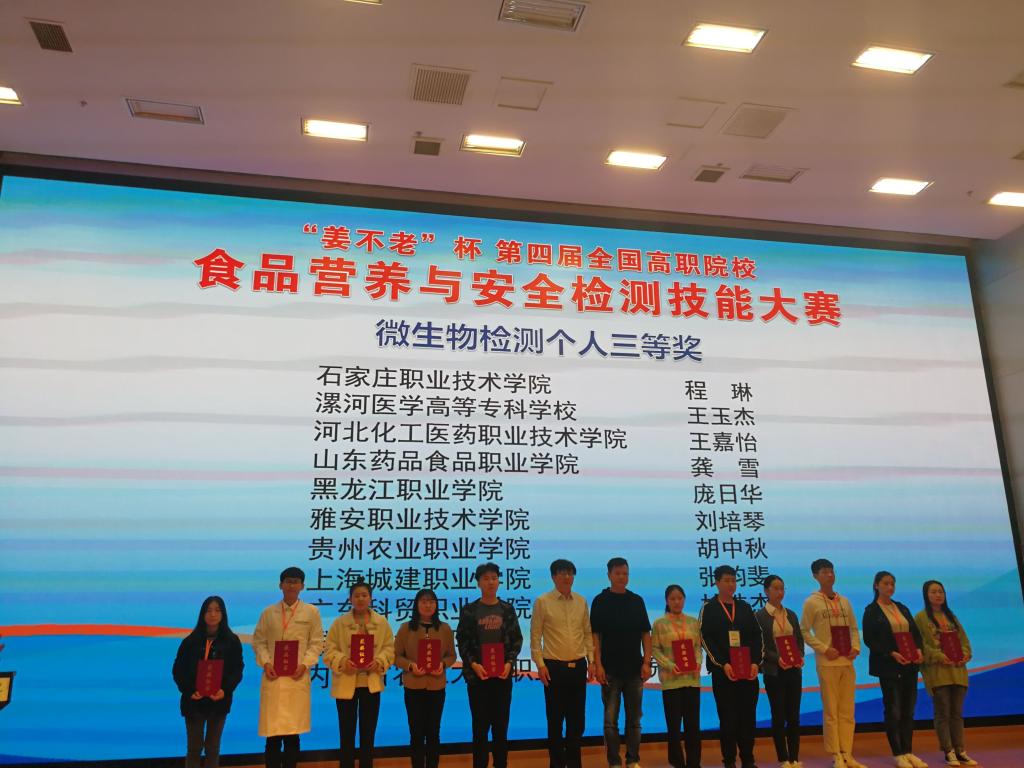 11月14——17日,由全国食品工业职业教育教学指导委员会主办的第四届全国食品营养与安全检测高职院校在校生技能大赛落下帷幕,来自23个省,160位参赛选手,83个代表队参赛,永利官网食品药品学院教师陶玉霞、马艳梅指导的学生李玉杰、庞日华分别在营养素检测赛项和微生物检测赛项中获得一等奖和三等奖,永利官网综合分数喜获团体总成绩一等奖。